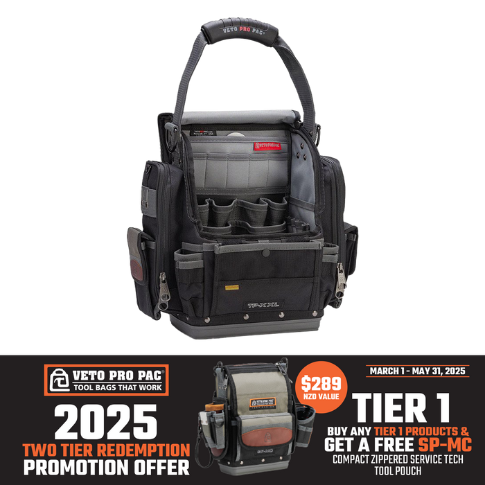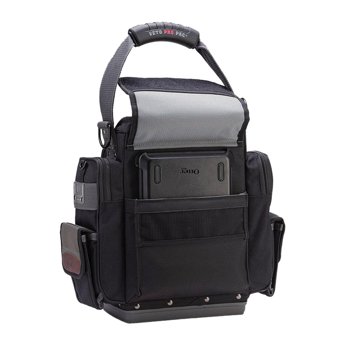The TP-XXL is a closable mid-sized tool pouch designed with integral side mounted padded meter pockets. The TP-XXL can be customised to hold a variety of tools, meters, fasteners, small tablet computer, and various other gear.