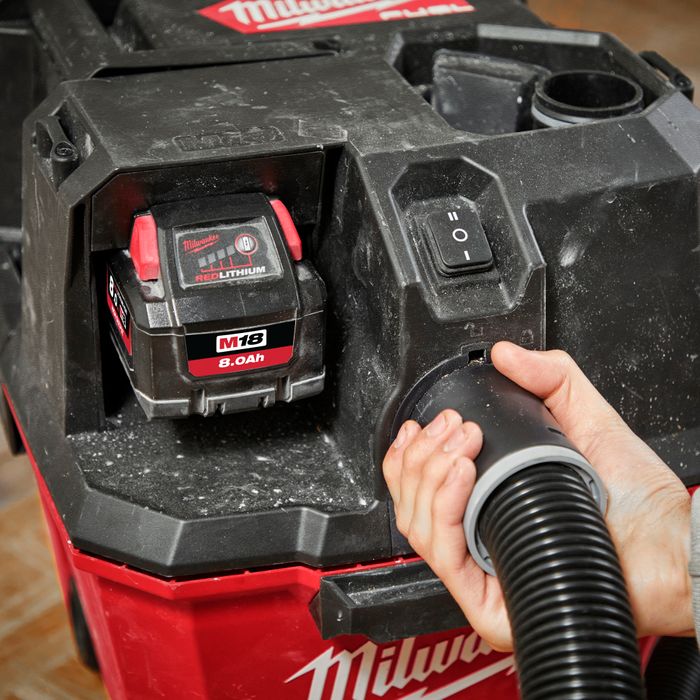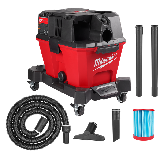 Milwaukee®'s M18 FUEL™ 23L Wet/Dry Vacuum brings unmatched performance, durability, and versatility to jobsite cleanup. The POWERSTATE™ Brushless Motor and optimised components provide maximum cleaning power. The Wet/Dry Vacuum cleans up common jobsite debris like wood/metal shavings. This vacuum provides users with durable wheels and hoses with reinforced casters and tread design for extended wheel life. The crush and twist-resistant hose construction also delivers extended hose life. Milwaukee® aims to provide a complete wet/dry vacuuming solution to deliver the optimal performance, holding capacity, and mobility with the easy access foot pedal. MAX POWER MODE delivers up to 31 minutes of continuous cleaning time (up to 92 m² / 1,000 ft²) per charge on a M18™ REDLITHIUM™-ION HIGH OUTPUT™ 12.0Ah Battery (M18HB12). MAX RUN-TIME MODE delivers up to 47 minutes of continuous cleaning time (up to 120 m² / 1,300 ft²) per charge on a M18HB12 battery. The included Large Wet/Dry Vacuum HEPA Filter ensures optimal dust and microparticle collection. Users can use Milwaukee® Fleece Dust Bags for less debris build-up on the filter. Integrated accessory storage allows for easy access to the crevice tool and utility nozzle on the motorhead, with more accessory storage spots on the removable Wet/Dry Vacuum cart.