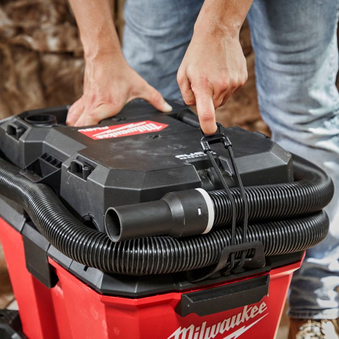 - The wet/dry vac cleans up common jobsite debris like wood/metal shavings