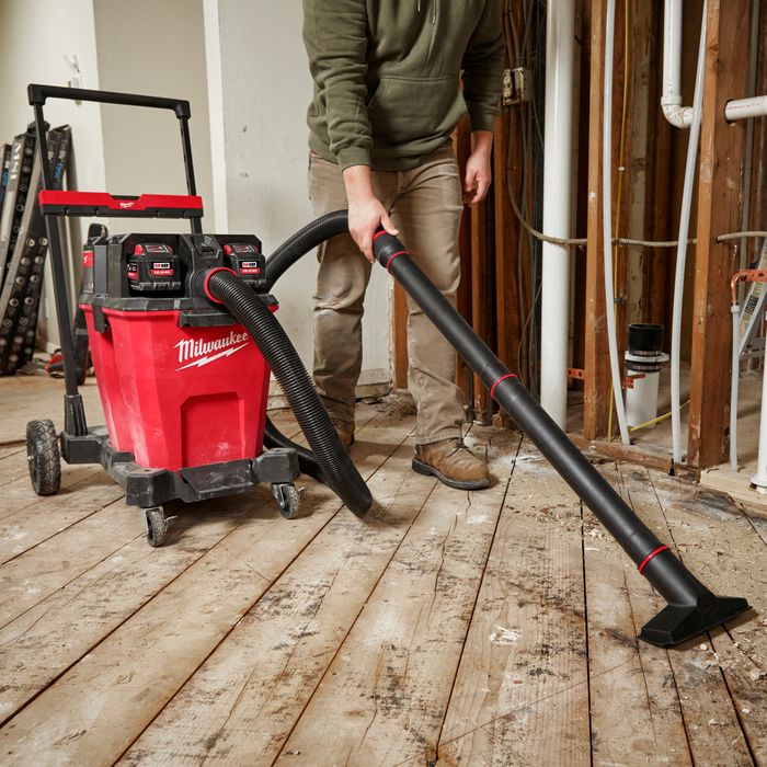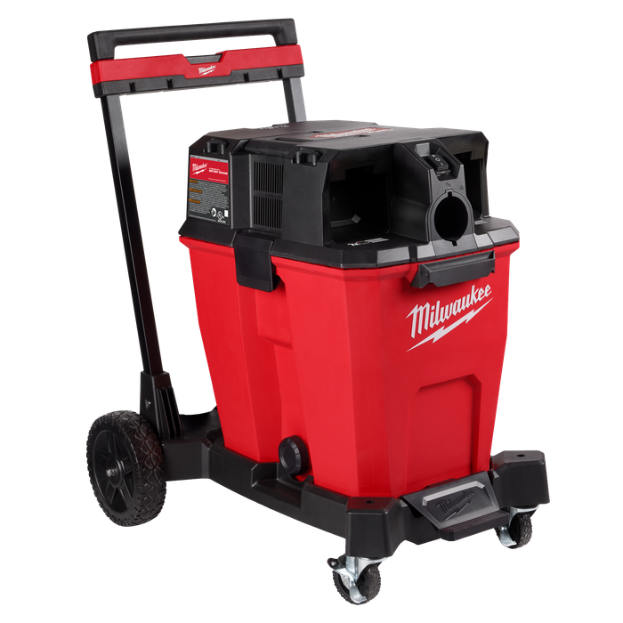 Milwaukee®'s M18 FUEL™ 45 Litre Dual-Battery Wet/Dry Vacuum brings unmatched performance, durability, and versatility to jobsite cleanup. The POWERSTATE™ Brushless Motor and optimized components provide maximum cleaning power. The MILWAUKEE® Dual-Battery Motor Head requires (2) M18™ REDLITHIUM™-ION HIGH OUTPUT™ 12.0Ah Batteries (M18HB12) to operate and cleans up common jobsite debris like wood/metal shavings. This vacuum provides users with durable wheels and hoses with reinforced casters and tread design for extended wheel life. The crush and twist-resistant hose construction also delivers extended hose life. Milwaukee® aims to provide a complete wet/dry vacuuming solution to deliver the optimal performance, holding capacity, and mobility with the easy access foot pedal. MAX POWER MODE delivers up to 34 minutes of continuous cleaning time (up to 148 m² / 1,600 ft²) and up to 49 minutes (up to 167 m² / 1,800 ft²) on MAX RUN-TIME MODE per charge on (2) M18™ REDLITHIUM™-ION HIGH OUTPUT™ 12.0Ah Batteries (M18HB12). The removable telescoping handle increases mobility with three adjustable heights. The included Large Wet/Dry Vacuum HEPA Filter ensures optimal dust and microparticle collection. Users can use Milwaukee® Fleece Dust Bags for less debris build-up on the filter. Integrated accessory storage allows for easy access to the crevice tool and utility nozzle on the motorhead, with more accessory storage spots on the removable Wet/Dry Vacuum cart.
