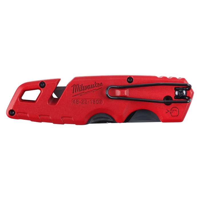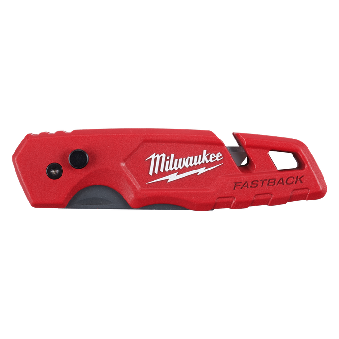 Milwaukee's FASTBACK™ Folding Utility Knife with Blade Storage features a press and flip mechanism for easy, one-handed opening. This press and flip open utility knife offers you tool-free blade changes for fast blade swaps with a metal extension over the button to prevent accidental blade removal. The FASTBACK™ Folding Utility Knife has onboard blade storage, allowing you to store 5 extra blades and has a wire stripper for increased productivity. It has a metal body that provides durability and an integrated gut hook for versatility. The FASTBACK™ Folding Utility Knife has a durable wire belt clip which help to reduces pocket tearing and a blade holder designed for scoring.