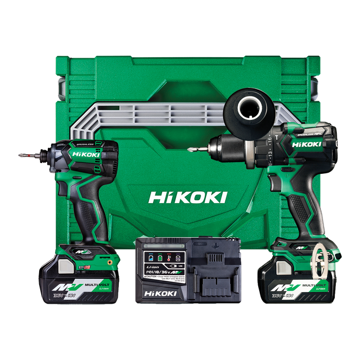 HiKOKI 36V Brushless Impact Drill & Impact Driver Kit featuring best-in-class power and performance from the DV36DC 36V 155Nm Impact Drill paired up with our legendary WH36DC 36V 215Nm Triple Hammer Impact Driver.
