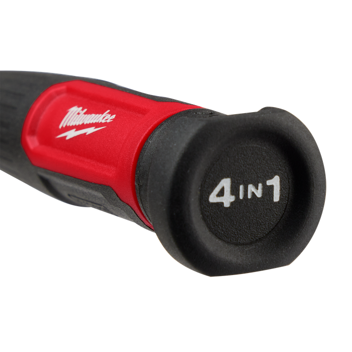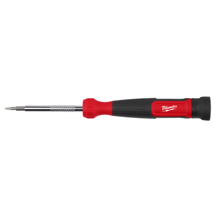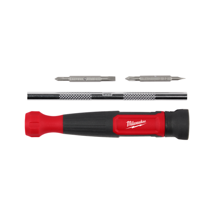 The Milwaukee® 4-in-1 Precision Multi-Bit screwdriver is more versatile and has better control for driving and precise tuning. This multi-bit driver features a 360-degree rotating back cap which offers greater control for speed and precision on the jobsite. It also has a comfortable, non-slip grip for maximum control. The two double-sided bits are stored neatly in the removable shank for quicker bit switches. The chrome-plated bit holder provides rust protection and reduces wear from elements on the jobsite. Our Milwaukee® 4-in-1 Multi-Bit Screwdriver is backed by Milwaukee's Limited Lifetime Warranty.