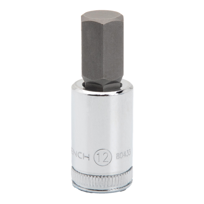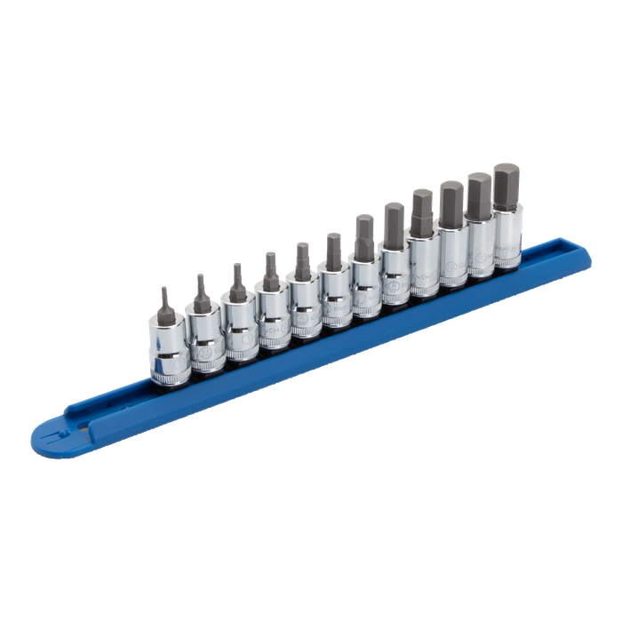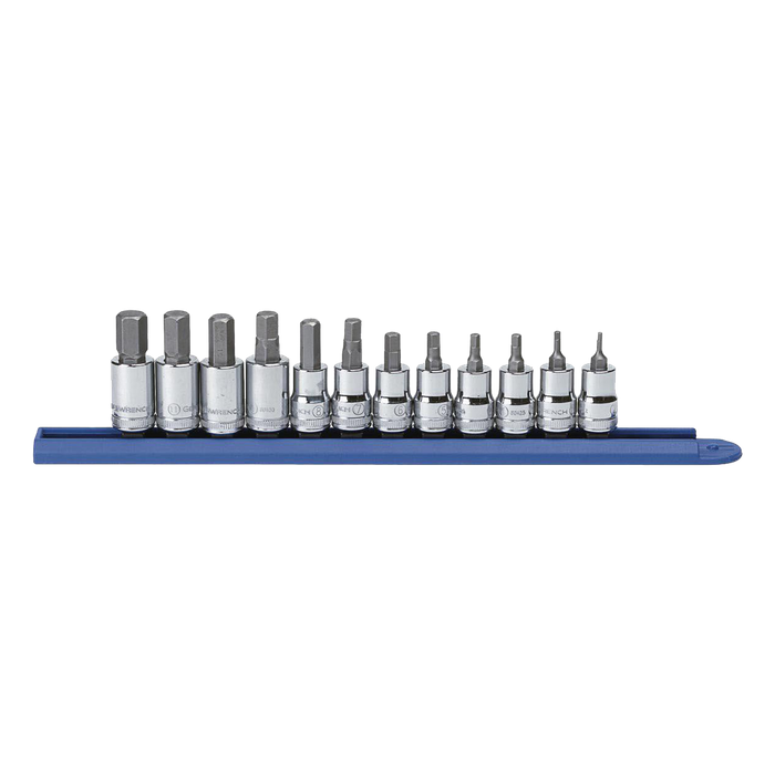 GEARWRENCH bit sockets have heat treated alloy steel base sockets and S2 steel bits for durability and long tool life. Our hex bit sockets help users loosen & tighten internal hex fasteners. The 12 piece 3/8" drive metric hex bit socket set comes with a socket rail for storage and organization and includes sizes 2mm, 2.5mm, 3mm, 4mm, 5mm, 6mm, 7mm, 8mm, 9mm, 10mm, 11mm, and 12mm.