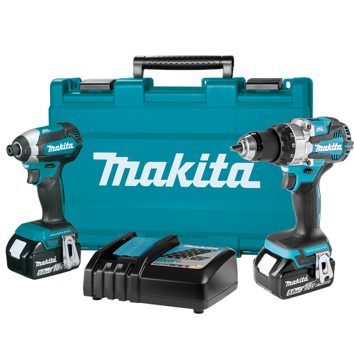 The 18V LXT Brushless 2-Piece Combo Kit (DLX2507T) delivers two premium brushless tools for drilling, driving, and fastening. The Kit includes two 18V LXT 5.0Ah batteries, which are compatible with the full range of Makita tools and products