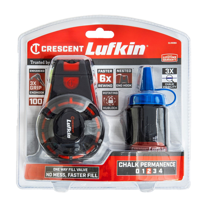 Crescent chalk reels are feature-rich in order to make every pro’s work easier. With a one-way refill valve and a quarter-turn removable top, filling the chalk reel is quick and clean. A one-hand hub lock keeps the reel firmly secured and the end hook slides securely into a storage recess so it won’t catch on other items in your tool bag. With a 6:1 gear ratio, retraction is fast and the compound braided line improves chalk retention for well-defined lines, snap after snap.