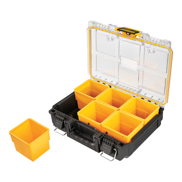 Get optimal organisation with the ToughSystem 2.0 Deep Compact Organiser. It has 6 removable deep organiser cups, you can customise your deep organiser cups by inserting plywood dividers to best suit your needs. Contents are protected with its IP65 rating for dust and water resistance while the transparent lid enables you to see the contents inside. Conveniently carry ToughSystem 2.0 Deep Compact Organiser using the top carry handle or connect to any ToughSystem 2.0 product with its patented auto-connect side latches. The ToughSystem 2.0 Deep Compact Organiser is compatible with any ToughSystem 2.0 product.