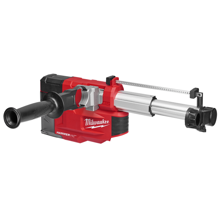 The M12™ HAMMERVAC™ Universal Dust Extractor is a comprehensive solution for eliminating dust when drilling with any SDS Plus rotary hammer. The onboard universal dust extractor with universal side handle allows users to operate it with any SDS Plus rotary hammer, Milwaukee, or other. The AUTOPULSE filter cleaning mechanism cleans the filter automatically after use to remove debris that could otherwise become lodged. Users will be able to safely drill into common construction materials like concrete, stone, brick and mortar with protection from harmful respirable crystalline silica. The M12™ HAMMERVAC™ Universal Dust Extractor allows the user to drill up to 203 mm (8") in depth and up to 32 mm (1-1/4") in diameter with the two included nozzles, designed for small and large diameters. The adjustable depth stop allows the user to quickly and accurately set the desired hole depths. When the translucent dust box is full, it can be emptied without exposure by hooking it up to a large dust extractor to vacuum out the dust. This M12™ Universal Dust Extractor has an Auto On/Off Mode to save the user time and battery life, by automatically activating suction when drilling. The MILWAUKEE® M12™ HAMMERVAC™ runs off any Milwaukee M12™ REDLITHIUM™-ION Battery, to be a fully self-powered, cordless unit for maximum portability.