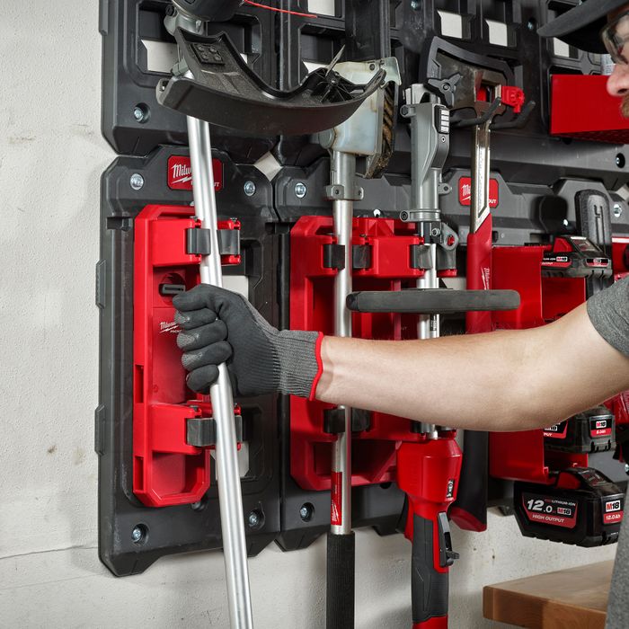 The PACKOUT™ Long Handle Tool Holder delivers secure mounting when paired with PACKOUT™ Wall Plates, strongly holding the PACKOUT™ solution mounted to the wall. This Long Handle Tool Rack is optimised to store outdoor power equipment like QUIK-LOK™ Attachments, long-handled tools and more. The Quick Access Tool Clamps make it easy to retrieve and store your long-handled tools, while the anti-slip rubber grips prevent tools from falling. MILWAUKEE® PACKOUT™ is the industry's most versatile and durable modular storage system allowing you to fully customize your workshop, garage or vehicle