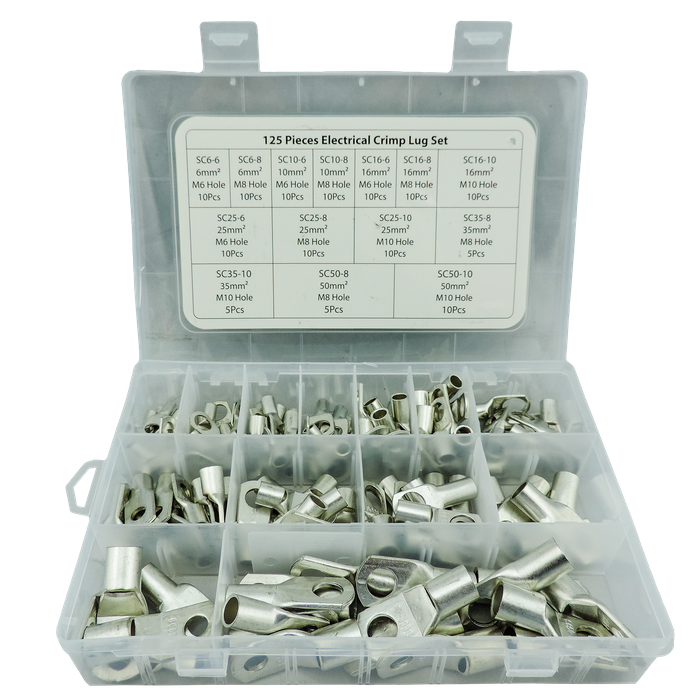 This handy set holds all the crimping lugs you could ever need, ranging from 6mm2 to 50mm2 they all come stored in a handy categorised and sectioned carry case, with an easy identification chart to find which is which. Constructed from high-grade copper for exceptional electrical conductivity, ensuring minimal energy loss and guarantees long-lasting performance. These Cable lugs can be crimped or soldered and feature a flared opening for easy wire insertion. Whether you're a seasoned electrician or a DIY enthusiast, this set is your go-to solution for all electrical crimping needs.