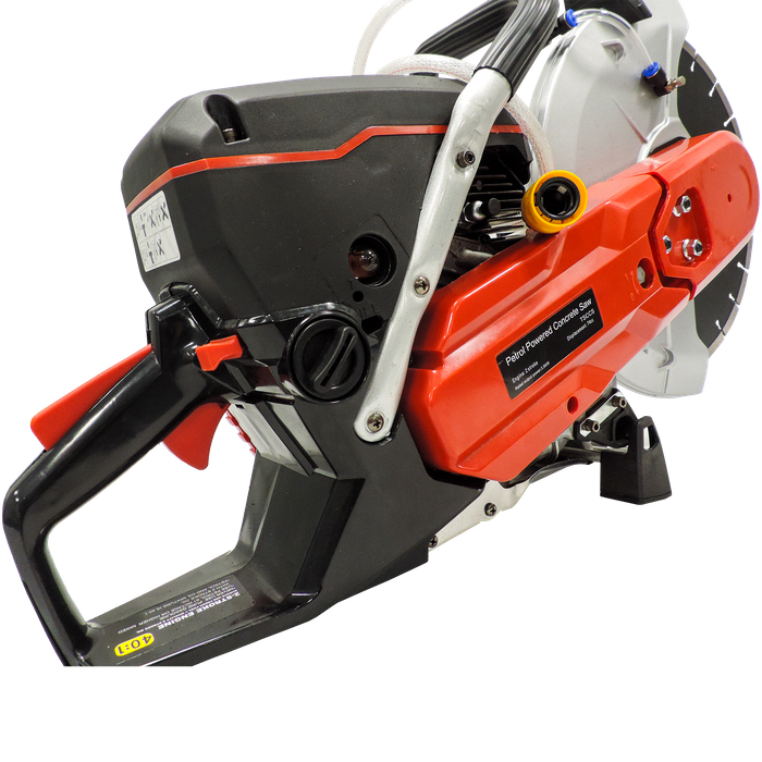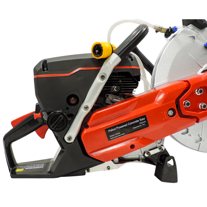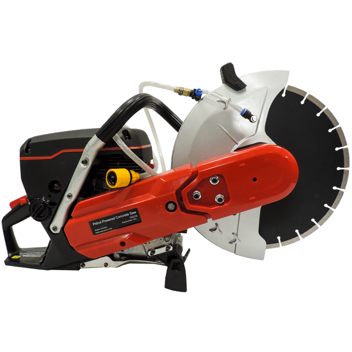 Powered by a 2-stroke, air-cooled, 74cc/rev engine, this little beast has an open throttle load of 9300RPM and delivers a maximum output of 3.5kW. It comes complete with a 350mm Diamond Cutting Blade, and features a water hose junction on the guard to cool down the blade while cutting, which also helps to manage dust.