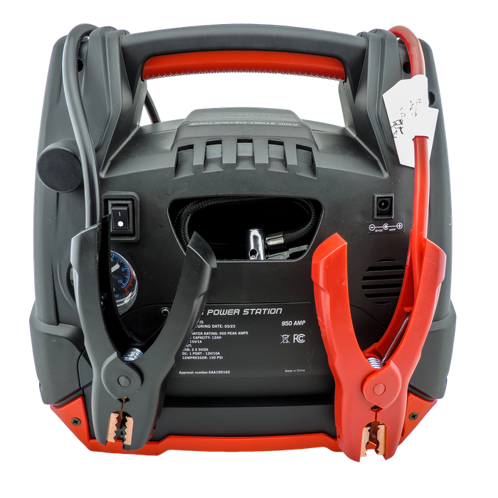 This is a perfect little portable but powerful Jump Starter for getting small vehicles back up and running, or to take out camping as a battery Power bank and a built-in air compressor. The powerful 12AH Lead-Acid battery offers up to 950 Amp peak starting current and is big enough to jump-start a motorbike, car, or light truck on a full charge.