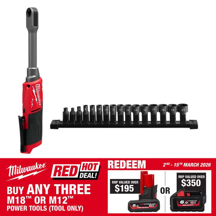 Max torque of up to 81.3Nm and 350 RPM to remove stubborn fasteners. Experience maximum versatility with the provided INSIDER Extended Reach Pass-Through Ratchet Sockets (8-19, & 21mm), ¼” & 3/8” anvil adapters and ¼” Hex bit adapter to tackle any job in the shop. The INSIDER 6 Point Sockets allow for pass-through up to 15mm to run nuts on threaded rods and eliminate the frustration of sockets bottoming out. Our M12 FUEL™ INSIDER Extended Reach Pass-Through Ratchet is part of the M12™ System, which is fully compatible with over 200 solutions.