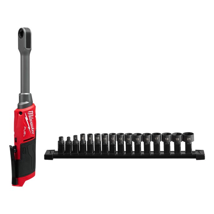 Max torque of up to 81.3Nm and 350 RPM to remove stubborn fasteners. Experience maximum versatility with the provided INSIDER Extended Reach Pass-Through Ratchet Sockets (8-19, & 21mm), ¼” & 3/8” anvil adapters and ¼” Hex bit adapter to tackle any job in the shop. The INSIDER 6 Point Sockets allow for pass-through up to 15mm to run nuts on threaded rods and eliminate the frustration of sockets bottoming out. Our M12 FUEL™ INSIDER Extended Reach Pass-Through Ratchet is part of the M12™ System, which is fully compatible with over 200 solutions.