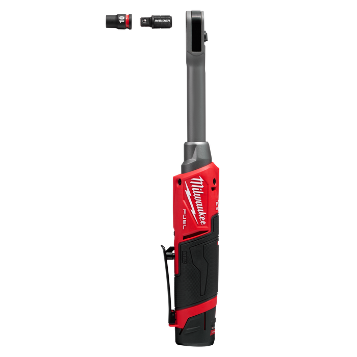 The M12 FUEL™ INSIDER Extended Reach Pass-Through Ratchet w/ Insert Accessories is a new-toworld solution that reinvents the traditional ratchet. The low-profile head design allows compatible sockets & adapters to insert directly into the tool. The INSIDER Pass-through Ratchet delivers maximum versatility and access in tight spaces. The extended paddle switch allows users to reach deep into the engine bay and manoeuvre the tool into multiple grip positions. The INSIDER delivers a