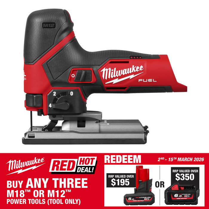 Designed for the professional carpenter and remodeler, the M12 FUEL™ Jig Saw is optimised for power and precision on the jobsite. The M12 FUEL™ Jig Saw delivers Fast 12V Blade Speed Under Load, Ease of Control in More Orientations, and Maximum Cut Line Visibility. The POWERSTATE™ Brushless Motor and REDLINK PLUS™ Intelligence delivers 3,000 strokes per minute at a 22mm stroke length for clean, controlled cuts in a wide variety of finish materials. The compact size, low vibration, and ergonomic barrel-grip design provide maximum control across standard and inverted orientations of usage. The Jig Saw is equipped with an On/Off LED light and On/Off dust blower to optimise cut line visibility for the application at hand. The M12™ FUEL Jig Saw features orbital action with 5 adjustment levels, variable speed dial, blade storage, tool-less blade change and a durable aluminium base plate with bevel detents.