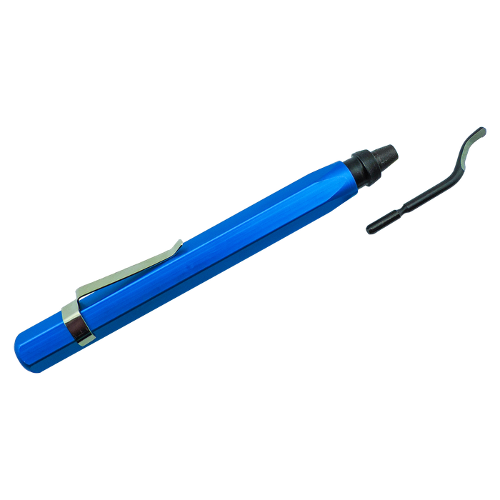 This pen-sized deburring tool is ideal for quickly removing burrs from multiple materials including steel, aluminium, and plastics. Constructed of strong aluminium, brushed and painted for a stylish finish, the tool has an all-metal design to ensure durability while in use on the job site. A great feature of this Deburring Tool is the removable pocket clip so you can store the tool safely and securely in your pocket while walking about the job site. This handy little tool also features a quick blade change function, which is as easy as pulling back the collar to remove the HSS blade to swap it out.