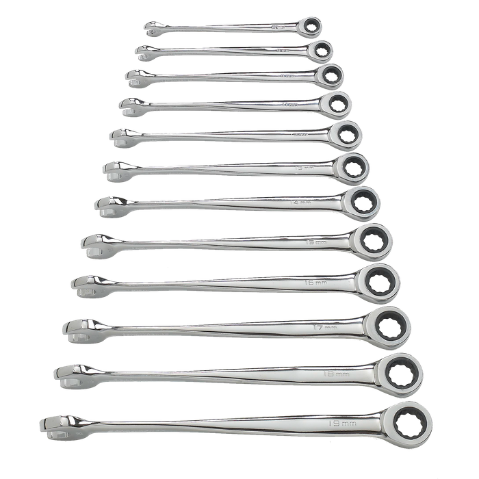 GEARWRENCH XL X-Beam™ wrenches to give you up to 500% more area for turning the wrench versus a standard wrench handle. The X-Beam™ allows you to apply force to the flat of the wrench, greatly reducing hand fatigue and pain. The XL X-Beam™ wrenches are 20% longer than our standard ratcheting combination wrenches, providing improved access and giving you the leverage to tighten or release the most stubborn fasteners. The ratcheting box end is designed to move fasteners with as little as 5°of motion, versus the 30° required for standard wrenches. The wrenches have strong alloy steel bodies with a bright, full polish chrome finish. The ratcheting box end also features our off-corner loading design that grips securely and reduces fastener rounding. The XL X-Beam is available in ratcheting combination, reversible ratcheting combination, and flex combination styles.