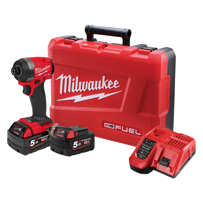 Includes: (1), M18 FUEL™ 1/4" Hex Impact Driver, (2) M18™ REDLITHIUM™-ION 5.0Ah Battery, M12™ & M18™ Rapid Charger, (1) Bit Holder, (1) Belt Clip, (1) Carrying Case.