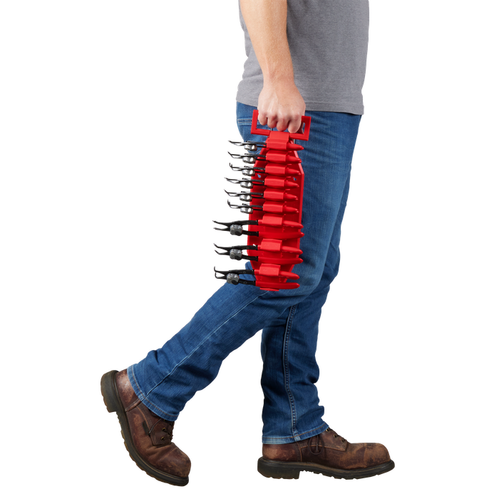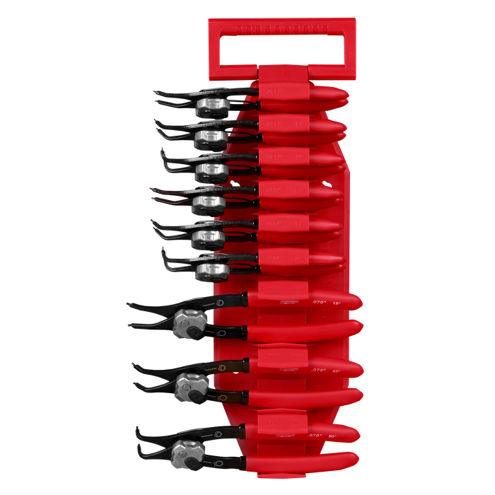 9pc Convertible Snap Ring Pliers Set features an all-metal dial that quickly switches between internal and external modes. The all-metal dial is more durable than competitors. The anti-slip dial makes it easier to convert the pliers when working with both internal and external snap rings. The allmetal dial provides the ability to withstand harsh environments. The adaptable storage rack optimises drawer space by including a detachable handle to fit in tight spaces or carry on the go. The storage rack also includes magnets and hang holes to hang vertically when drawer space is very limited, making for the most adaptable snap ring plier storage