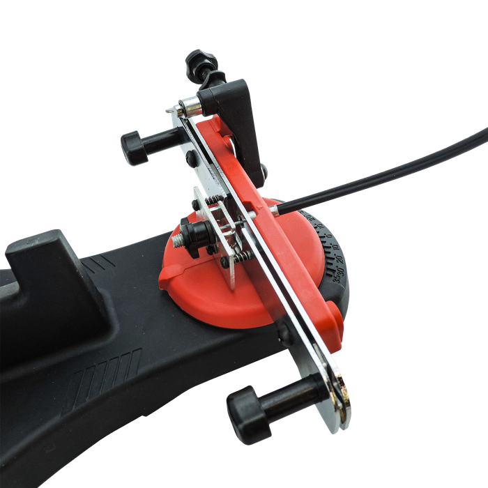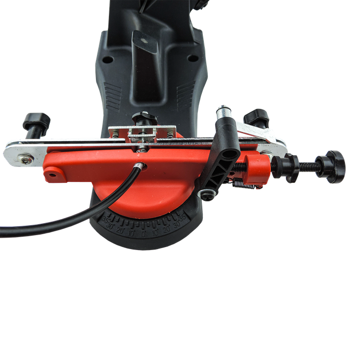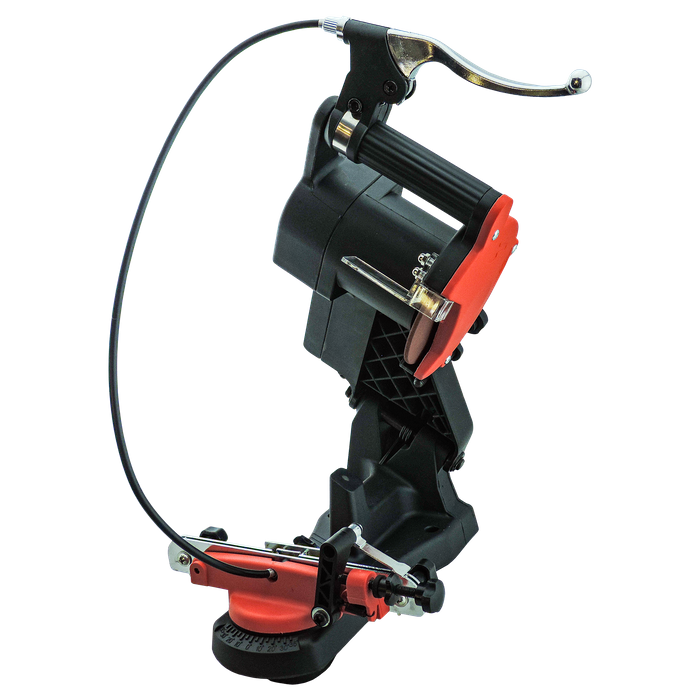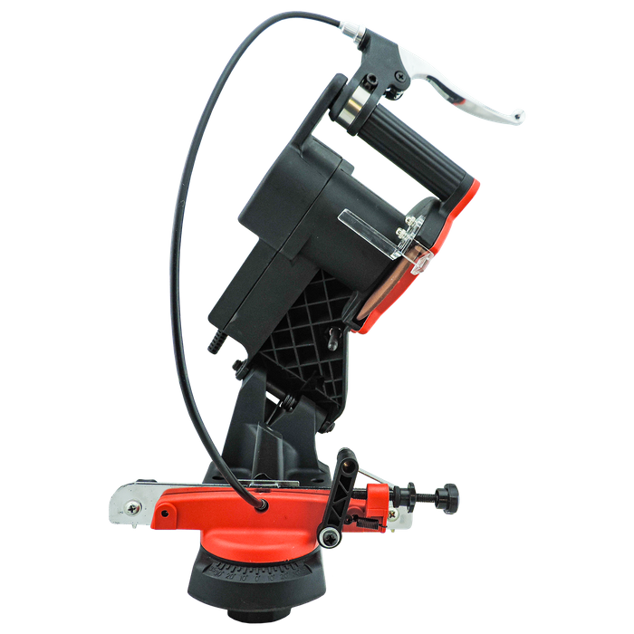This electric sharpener features two adjustment knobs along the chain feeder that allows you to rotate the chain left and right during sharpening, this eliminates the need to touch the blade and risk injury. A brake lock handle is located on the main handle which will lock the chain into place while you perform the sharpening, this holds the tooth secure during sharpening to provide an accurate cut. Also features an adjustable depth stop to prevent accidental damage to the chain during sharpening.