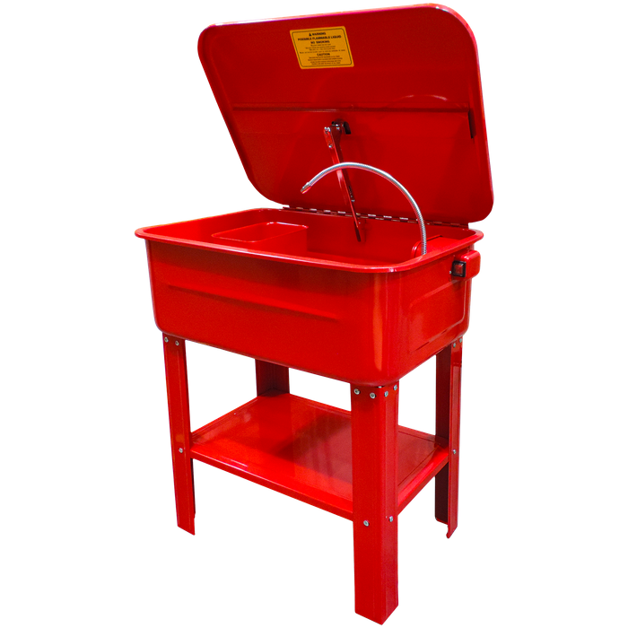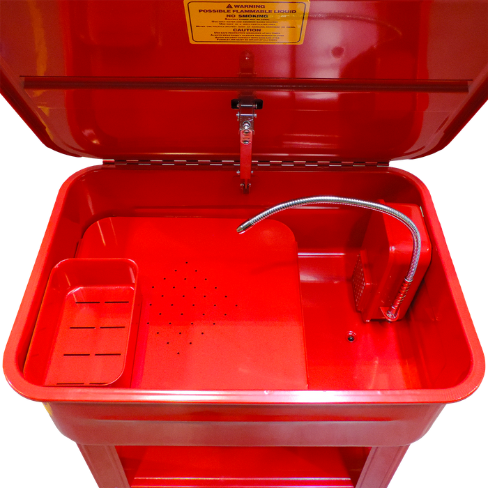 Crafted with a durable powder-coated welded steel construction so it won't tarnish and is rust-proof, this cleaner ensures longevity and reliability in demanding workshop environments. This unit is equipped with a removable shelf for added convenience, a movable basket/container that will keep the smaller bits in one tidy place, and a sealed powerful motor that will pump out 2.7-3.3LPM of solvent. The included stand adds stability and ergonomic functionality to the unit, making it a valuable asset for professionals seeking efficiency in their workspace.