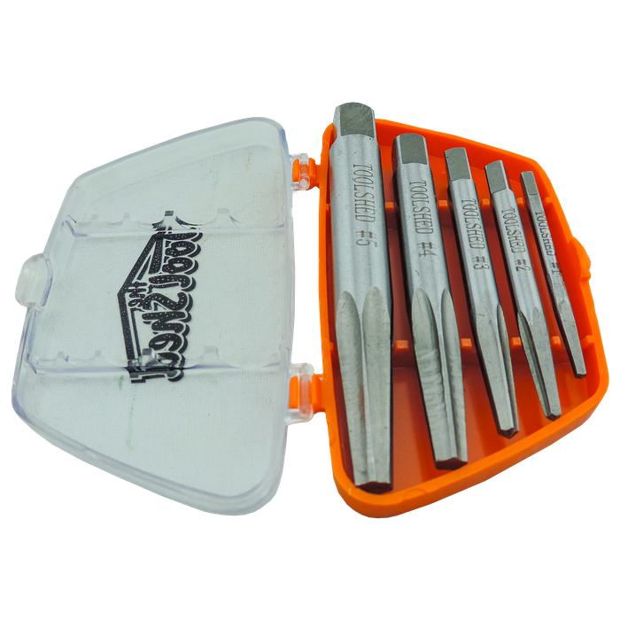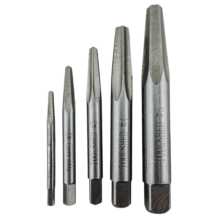 The ToolShed's premium Tapered Screw and Bolt Extractor Set is expertly crafted for the efficient removal of broken fasteners with both clockwise and counter-clockwise threads. Constructed from high-quality Carbon Steel, these extractors ensure superior strength and durability for demanding applications. The laser-etched sizing on each bit guarantees quick and accurate identification, complemented by a square shank that seamlessly integrates with most tools.