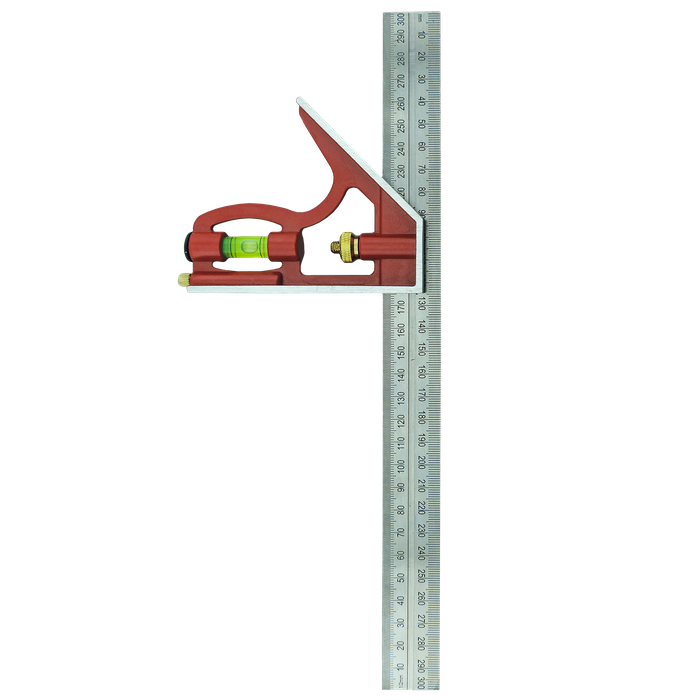 The key features of this combination square include a 360-degree impact-resistant vial, ensuring all-around visibility for accurate readings. Laser-etched markings in millimetres and 1/2mm increments facilitate ease of use and provide precise measurements. The heavy-duty cast iron head, finished in a stylish matte red, adds to the tool's durability and longevity. Moreover, it features top-quality brass nut and scriber fittings, enhancing its overall quality and performance.