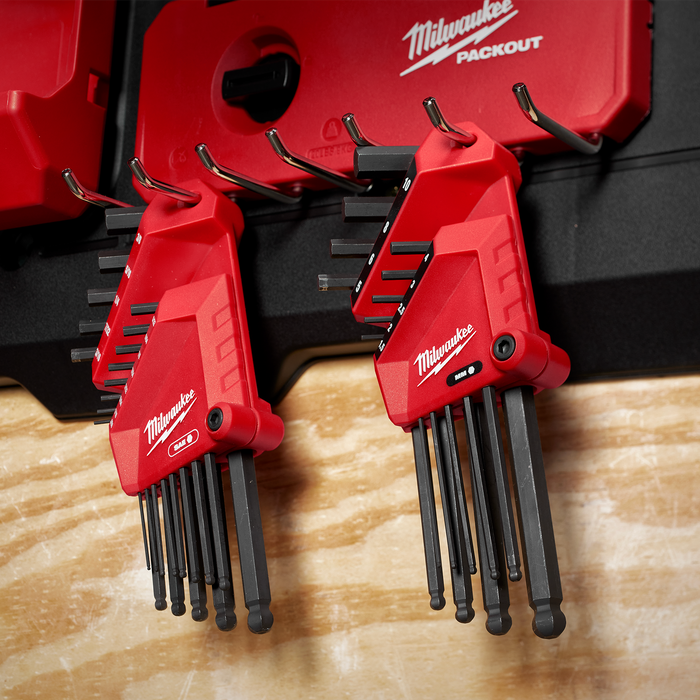 Milwaukee's 2PC Kit includes a 13-key SAE and a 9PC Metric L-Style Hex Key Set with Ball Ends that features the easiest access keys on the market. The pivoting holder with offset keys makes it quick and easy to grab the necessary size key. The allen keys withstand more torque and extend the life of the tool in the toughest jobsite conditions. The holder and keys have long-lasting, high-contrast markings for quick size identification. With a ball end, the keys are able to easily access fasteners even when at a difficult angle. The pivoting holder with a hang hole makes transportation and storage simple.