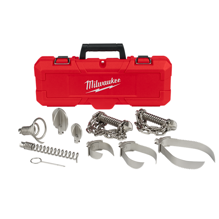 MX FUEL™, Milwaukee®'s new equipment system, goes beyond the limitations of petrol and corded units, utilising the industry's most advanced batteries, motors, and electronics to deliver the best experience for users. This is equipment, redefined. Milwaukee®'s Head Attachment Kit for 19 mm Drum Cable includes 9 tools for clearing the most common types of clogs. Durable steel construction prevents corrosion for long-lasting accessory heads. The Head Attachment Kit includes 9x Cable Head Attachments, a Pin Key, and Carrying Case. The attachments are designed for use with 19 mm Drum Cable for the MX FUEL™ Sewer Drum Machine with POWERTREDZ™ (MXLSCP-0Z).