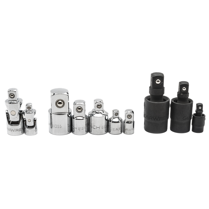 The GEARWRENCH master universal adapter set includes 1/4", 3/8", & 1/2" drive adapters and universal joints for hand and impact applications. They will allow the user to use different size ratchets, sockets, & extensions to reach all fasteners and get the job finished quickly.