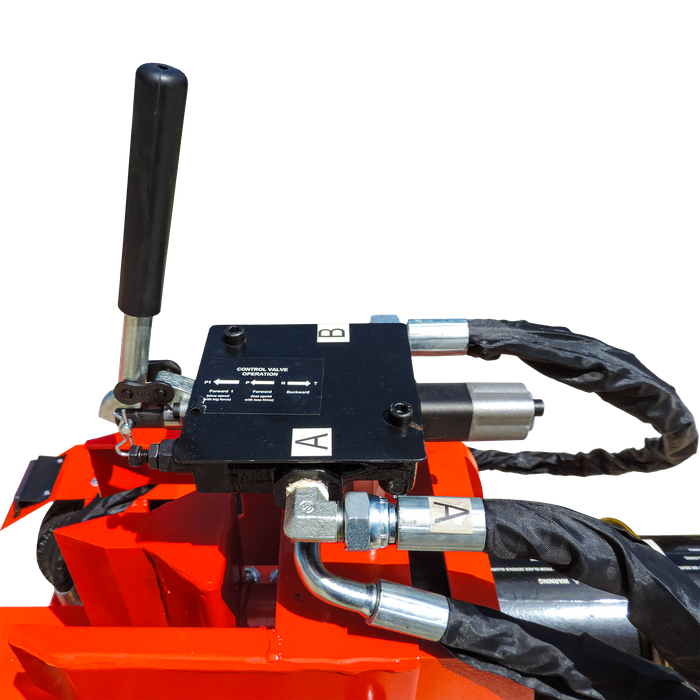The Tool Shed 27 Tonne Petrol Powered Portable Hydraulic Wood Splitter is built strong and to last. The hydraulic ram system is controlled by lever control and offers 27 tonnes of force with a maximum pressure of 3500PSI. A quiet 6.5hp 4-stroke petrol engine powers the ram which has a cylinder measuring 115mm in diameter and is 610mm long, featuring a 200mm high double welded splitting wedge. The ToolShed Portable Hydraulic Wood Splitter weighs 208kg and has large 400mm pneumatic tyres on the back with a 50mm hitch and fold out stand on the front. This makes it easy to manoeuvre whether you are rolling it out of the shed or attaching to an ATV to get around your block of land. A neat feature of this splitter is its ability to be used in both vertical and horizontal mode. Vertical mode is perfect for splitting large heavy logs that you can't fit onto the bed. The time for the ram to complete a full cycle from back to front, to back again is about 30 seconds. However, under normal operation you wouldn't do this as you may not need to take the ram all the way back nor would you need to take it all the way forward. When we tested it, we were getting about 10-15 seconds per cycle under normal splitting conditions.