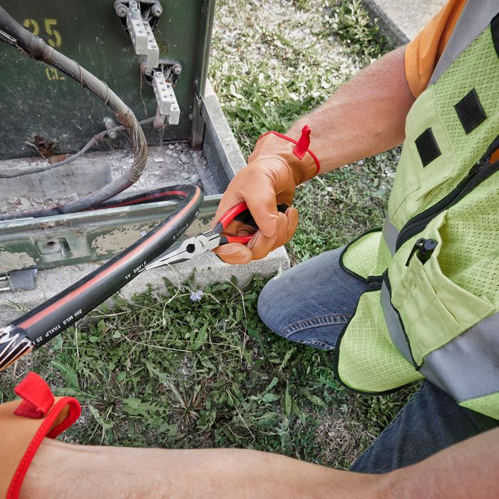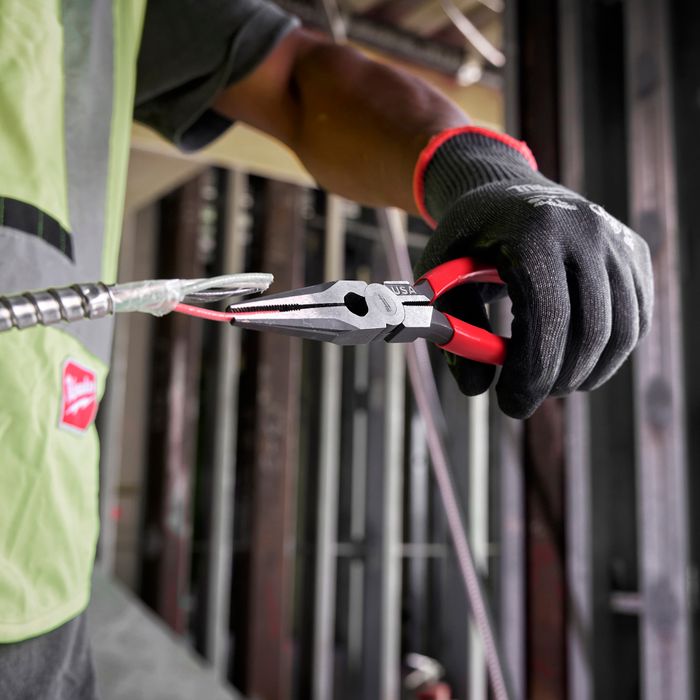 Milwaukee® USA Made Dipped Grip 203mm (8") Long Nose Pliers provide professionals with a tool that delivers the best grip and easiest cuts. Our needle nose pliers feature cross-hatched, laser-hardened teeth for maximum grip when pulling or twisting. The optimised pivot point is designed to give the best leverage during tough cuts. Our long-nose pliers are engineered to deliver the smoothest open and close experience from the start, with no break-in period required. For additional versatility, our pliers feature a reaming head for 12.7mm (½") to 25.4mm (1") conduit and a fish tape puller and are tether ready. Our Milwaukee Long Nose Pliers are made in USA with best-in-class manufacturing technology and USA-sourced materials, including durable, press-forged steel
