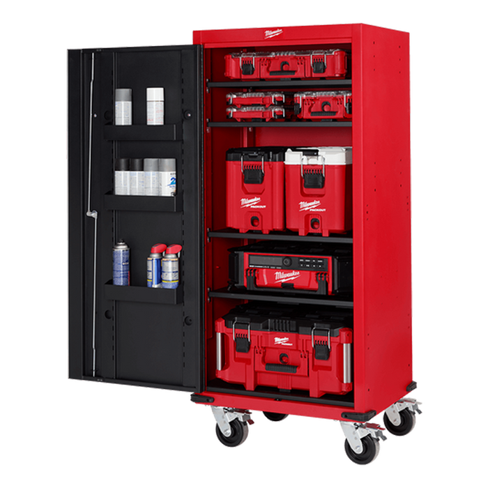The Milwaukee High-Capacity 27in Steel Locker is equally as versatile as it is tough. With many adaptable configurations, the locker can be a stand-alone storage solution or attached to multiple Milwaukee chests and cabinets. It can be secured to either the left or right side of your existing Milwaukee storage by flipping the locker door, while the interior space with its adaptable shelves has been designed to fit PACKOUT™ System solutions, including our PACKOUT™ Rolling Tool Box. The 6-gauge angle iron base makes this rolling cabinet very durable, with a total loading capacity of 907kg and 398 litres of interior storage capacity. Press nuts are pre-installed in the sidewalls for optional feature attachments such as a side handle, flip-up tray, bottle opener, paper towel holder, tool holder, and Milwaukee battery chargers. A rubber access grommet is located on the back wall for cord access if needed. The textured red and black powder-coated finish is durable and helps conceal finger smudges, dents, and scratches. The Milwaukee 27in High-Capacity Steel Locker has been built with the durability and storage space you need to get the job done.