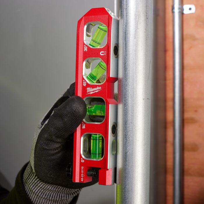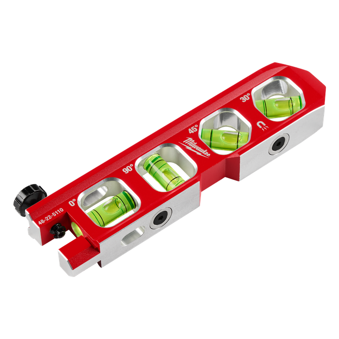 The Milwaukee® 4 Vial Torpedo Level features secure amplified rare earth magnets and is the ideal solution for making multiple consistent bends in pipe and metal work. This level is equipped with a non-removable thumb screw which prevents the screw from becoming lost on the jobsite. The 4 Vial Torpedo Level has precision machined surfaces it also features impact resistant vials that display angles of 0°, 30°, 45°, and 90° and has an aluminum frame that provides strength and durability. The level includes an added pipe groove and weld bead clearance which makes working with pipes easier.