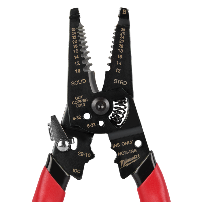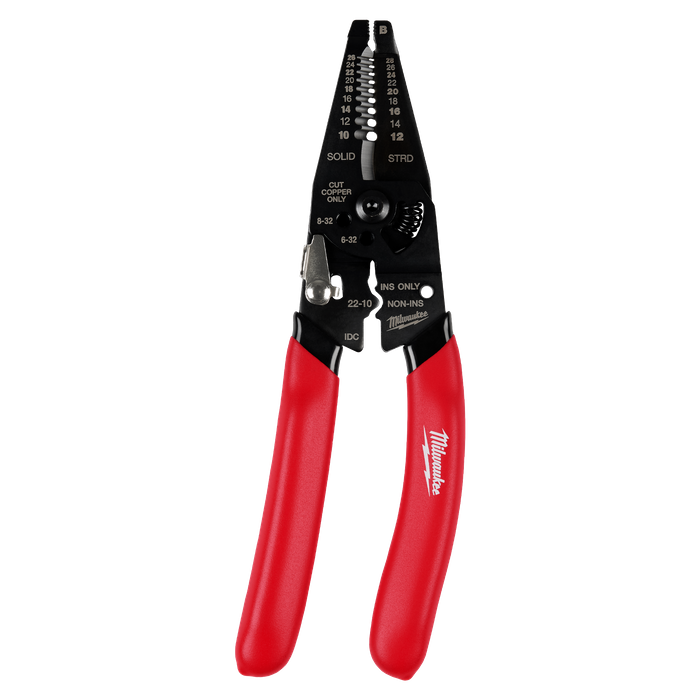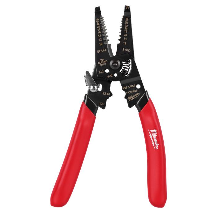 MILWAUKEE® Multi-Purpose Wire Stripper with Reinforced Head has been designed for added durability bending and twisting multiple wires. This versatile wire stripper accurately cuts and strips 0.14 – 6mm² (10-26 AWG) Solid and 0.08 – 4mm² (12-28 AWG) Standard wires and crimps B, Insulated, Non-Insulated, and IDC Connectors. The curved cutting blade was designed to cleanly cut through copper solid and stranded wires. The tool also features #6 (M3.5) (6/32) and #8 (M4) (8/32) threaded bolt shears with a threaded design for deburring the bolt, is spring loaded for easy opening, and locks for convenient storage in your pocket, tool pouch, or bag.