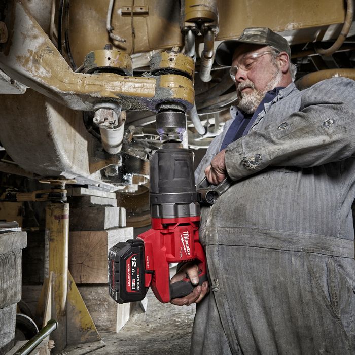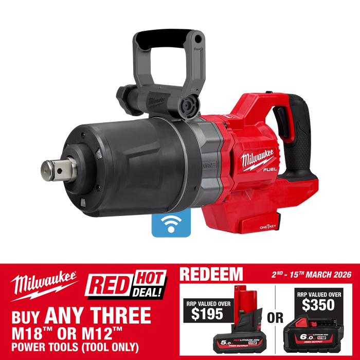 The M18 FUEL™ 1" D-Handle Short Anvil High Torque Impact Wrench with ONE-KEY™ is powered by a POWERSTATE™ Brushless Motor that delivers up to 2,711 Nm of nut-busting torque and 2,576 Nm of fastening torque, enabling you to complete the most demanding applications. With the runtime to install up to 200, 25mm bolts on a single M18™ REDLITHIUM™ HIGH OUTPUT™ 12.0AH Battery (M18HB12), the M18ONEFHIWF1DS0 provides maximum performance and cordless convenience, eliminating the need for compressors, generators, cords, and hoses. With no compressor or hose, you have greater productivity and portability to complete applications not accessible with a pneumatic unit. This reduces the cost of ownership by lowering energy costs and eliminating routine maintenance on compressors and generators. The REDLINK PLUS™ Intelligence ensures you achieve maximum performance and protects the High Torque Impact Wrench against overloads, over-heating, and over-discharge. A patented battery isolation system manages high frequency vibrations, enabling battery movement that prevents damage and ensures a constant connection between the battery and tool when in use. The 4-Mode DRIVE CONTROL (further customisable with ONE-KEY™) provides you with greater control over the output speed and power of the MILWAUKEE® High Torque Impact Wrench. The ONE-KEY™ Technology allows you to customise, track, and manage the impact wrench with the ability to set a repeatable torque output for maximum control.