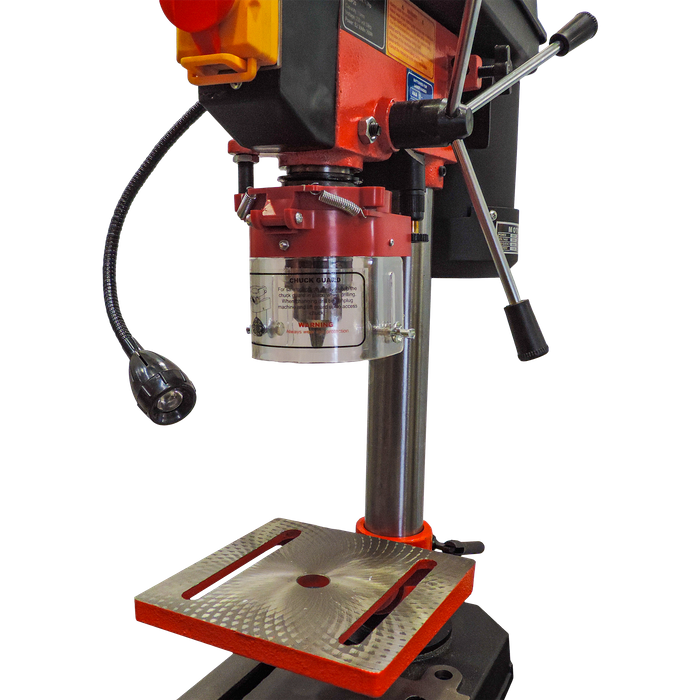 Ergonomics and safety are key priorities in the design of the ToolShed Drill Press. The ergonomic 3-handle feed wheel makes drilling operations smoother and less strenuous, while safety features like the Emergency stop button and spindle guard provide peace of mind during use. The drill press can drill into wood, metals, plastics, and more, aided by a laser line guidance system that projects X and Y axis lines onto your workpiece, ensuring precise alignment and drilling accuracy. Rapid speed adjustments are made simple with a quick reference chart and belt tension release knob. Constructed from heavy-duty steel and cast iron, this drill press is built to withstand rigorous use and deliver reliable performance.