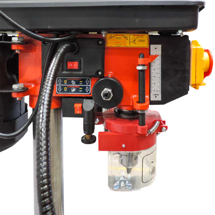 The fully adjustable worktable can be moved up and down, and tilted to the left or right with the additional aid of a tilt scale, allowing for precise angled drilling. The built-in depth stop, complete with a scale on the pinion shaft, ensures consistent drilling depths every time. For enhanced visibility during detailed work, the ToolShed Drill Press includes an integrated LED work light. This feature illuminates your workpiece, reducing shadows and enhancing accuracy. The drill press also boasts five different spindle speeds, ranging from 620 to 3140 RPM, giving you the flexibility to tackle a variety of materials and tasks with ease.
