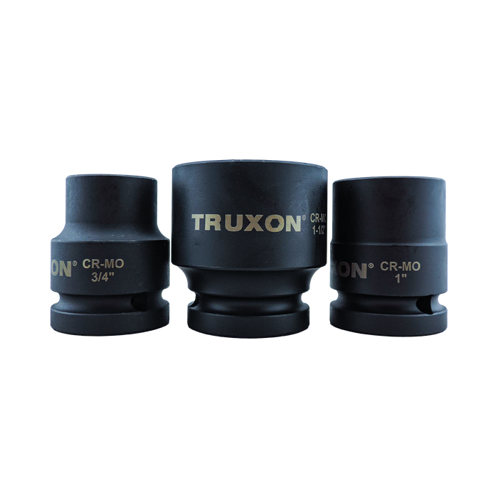 The TRUXON® 10 Piece Imperial Impact Socket Set, covering essential 3/4in drive imperial sizes from 3/4in through to 1-1/2in, is engineered for tradies who work with heavy machinery, trucks, agricultural equipment, and large industrial fasteners where strength and reliability are non-negotiable. Built from heat treated chrome molybdenum (Cr-Mo) steel, these sockets deliver exceptional impact durability and resist deformation under extreme torque, making them ideal for high-load applications and stubborn imperial fittings. The black phosphate finish provides long-lasting rust protection and a low-glare matte surface that performs well in both workshop and outdoor conditions.