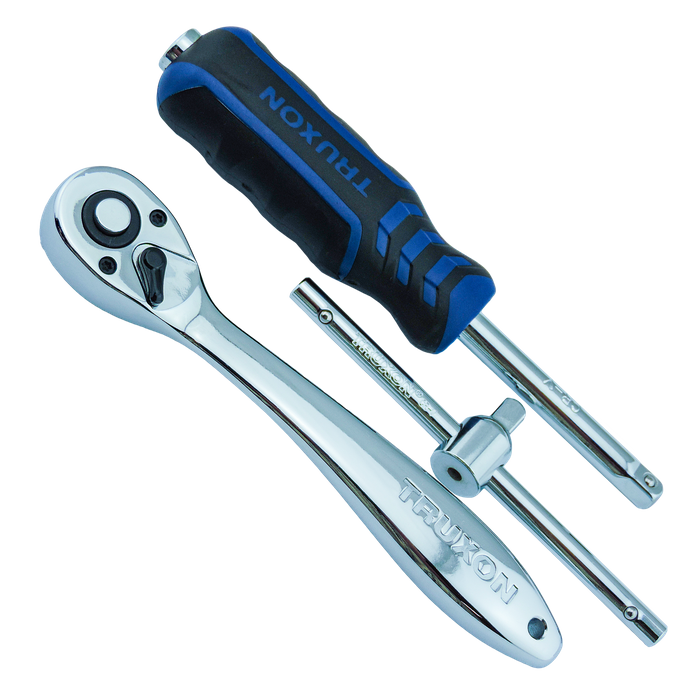 The TRUXON® 53 Piece Metric Socket Set 1/4in Drive is a premium all-in-one solution for professionals who need precision, versatility, and durability in a compact format. Forged from high-quality chrome vanadium (Cr-V) steel, every component delivers exceptional strength, long-term wear resistance, and reliable performance on the job. The rust-resistant mirror polish not only looks professional but also wipes clean easily after oily or dirty tasks. Each 6 point socket provides a secure grip on fasteners to reduce rounding, while deep-stamped size markings ensure quick identification that will not fade over time. A 90 tooth ratchet requires only 4° of swing, making it ideal for confined spaces, and the wobble extension bars offer up to 15° of flexibility for hard-to-reach fasteners. With standard and deep sockets, bit sockets, multiple extensions, hex keys, and specialty accessories all housed in a durable blow-moulded case, this 53 piece set delivers everything a professional needs for precise mechanical, automotive, and assembly work.