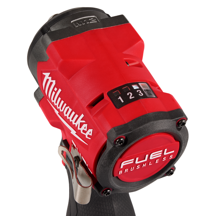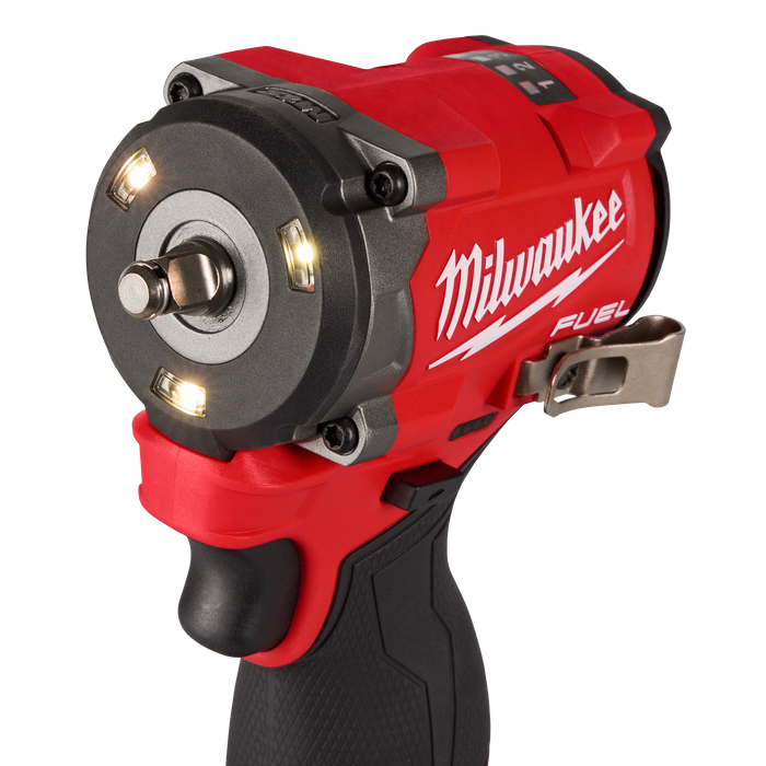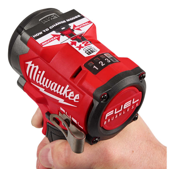 Milwaukee's new 3/8” Stubby Impact Wrench delivers maximum power, in a lightweight compact body and delivering 50% faster application speeds when compared to the previous generation. Leveraging POWERSTATE™ Brushless Motor, The M12 FUEL™ Stubby Delivers 0-3,000 RPM with up to 746 Nm of Nut Busting Torque, allowing the removal of corroded and stubborn applications. Our solution delivers on performance and size, at only 0.99 Kg for the bare tool. Users can expect less fatigue throughout their work week while fitting into tight spaces and allowing access where larger impacts can't fit without using additional accessories or disassembling components to reach the desired fastener. Equipped with Tri LED work lights to illuminate your work area without the frustration of shadows. A 4-Mode DRIVE CONTROL™ allows for greater precision. Featuring an AUTO SHUT-OFF™ mode that applies no more than 20 Nm of torque for hand-tight applications that prevent overtightening when in forward. In reverse, Bolt Removal Mode will slow down the RPM once the bolt is free to prevent bolts from flying around your work area. To change the modes, it is a single-handed operation. By shifting the forward-reverse shuttle into neutral and double-tapping the trigger, you will be able to change modes effortlessly.