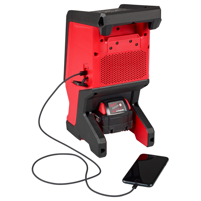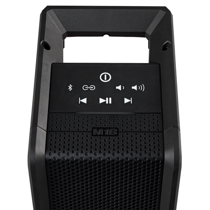 The M18™ Bluetooth® Jobsite Speaker delivers FULL RANGE SOUND and JOBSITE VERSATILITY. The 3.75” woofer and high frequency tweeter deliver optimised sound for medium sized spaces. Bluetooth® 5.3 provides up to 60 metres of range to keep you connected throughout the jobsite. AUDIO-LINK allows you to play music through multiple speakers by wirelessly daisy-chaining over 200 Milwaukee AUDIO-LINK compatible devices, creating a larger sound experience. The M18™ Bluetooth® Jobsite Speaker provides up to 18 hours of run-time at 100% volume on the M18™ REDLITHIUM™ 5.0Ah battery (M18B5). The built-in equaliser settings allow you to customise the bass and treble to your preferred sound and you can charge up personal devices wherever you go with USB-C 3.0A device charging. Utility cart, nail hook, and pass-through hanging capabilities are integrated within the handle design providing JOBSITE VERSATILITY. Water, dust, and impact resistant, the speaker withstands the most demanding jobsite environments.