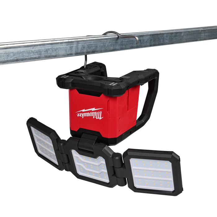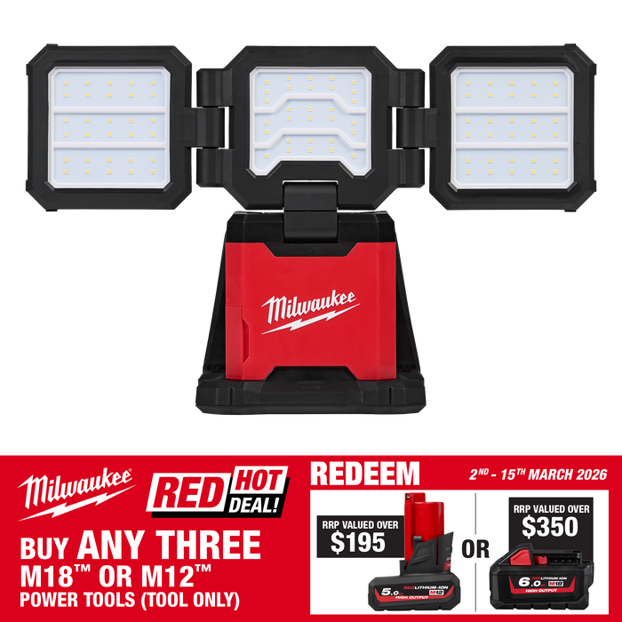 Milwaukee's M18™ Three Panel Flood Light delivers a high-performing 4,500 Lumens of flood and area lighting in a compact and portable size. The light has three folding panels that provide optimal lighting coverage, offering various brightness modes and individual light head power options for any jobsite need. With a versatile base featuring a hook, magnet, and keyholes, you can effortlessly mount this light overhead in any jobsite environment. The M18™ Three Panel Flood Light delivers 4,500 lumens of TRUEVIEW™ High-Definition Output for 3 hours of runtime on high mode with an M18™ REDLITHIUM™ 5.0Ah Battery. On its lowest brightness setting, the light provides up to 30 hours of runtime. Compatible with AC power, the light can provide all day runtime. Designed with the jobsite in mind, the M18™ Three Panel Flood Light can withstand drops up to 2.7 metres, and is backed with a 5 Year Tool and a limited lifetime LED Warranty.