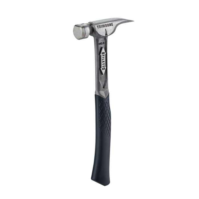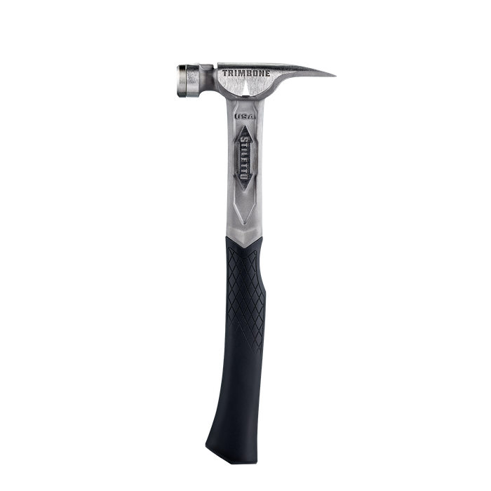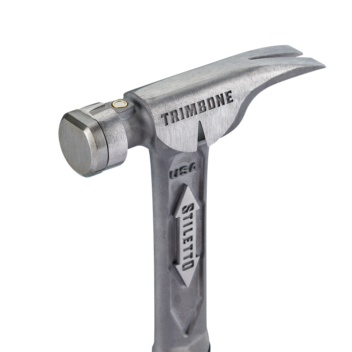 The STILETTO® 10oz TRIMBONE™ Hammer with Smooth Steel Face and Curved Handle is designed for finish with specialized features. This titanium hammer is 45% less weight and hits like steel. The compact D-Face and Trim Claw are ideal for tight spaces. The TRIMBONE™ also features a steel face and a replaceable colored grip, available in 6 colors, extending the life of the hammer and providing a personal touch. The 180° side nail puller is ideal for 2D-10D nails but has the power to pull up to 16D.