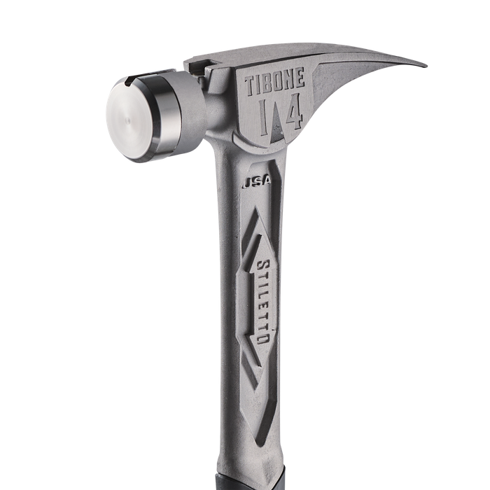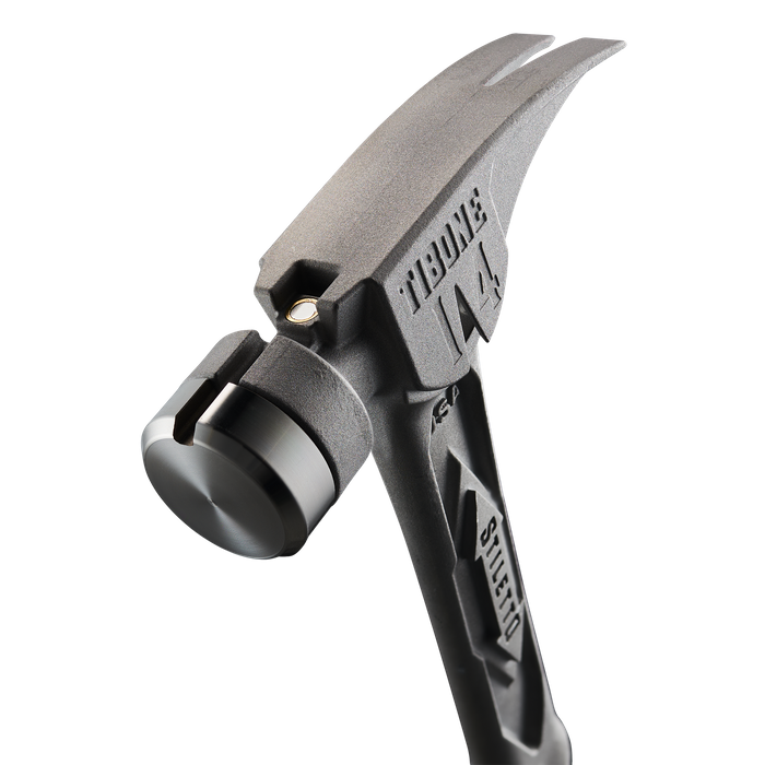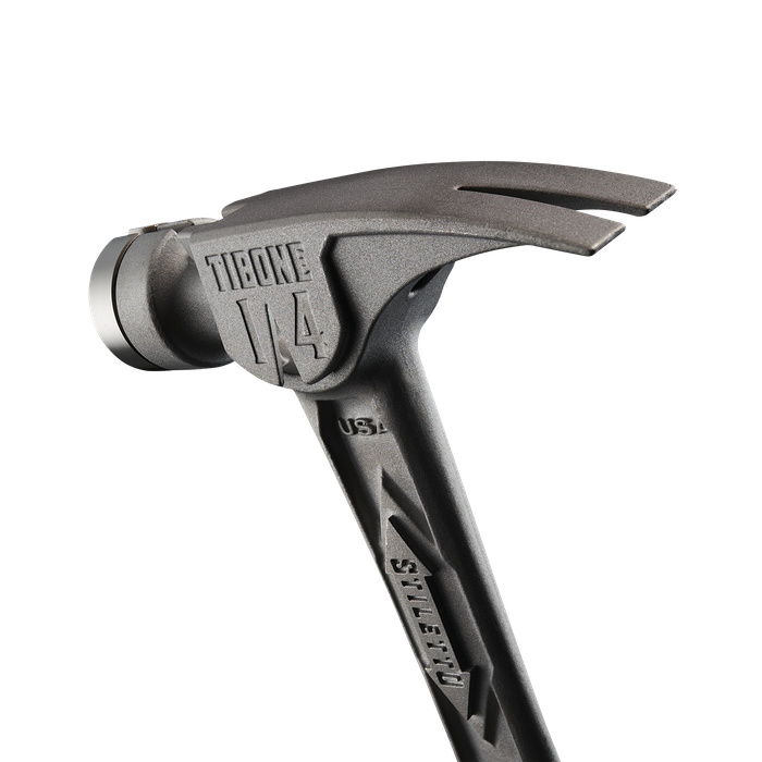 The STILETTO® 14oz TIBONE™ Hammer with Smooth Steel Face and Curved Handle is our most powerful and most durable hammer. This All-Titanium hammer is 45% less weight and hits like steel. The durable TIBONE™ design is best for framing and pulling nails. The 180° Side Nail Puller and Magnetic Nail Starter fit up to 16D and Duplex Nails. The TIBONE™ features a replaceable steel face and multiple grip colors, extending the life of the hammer and providing a personal touch.
