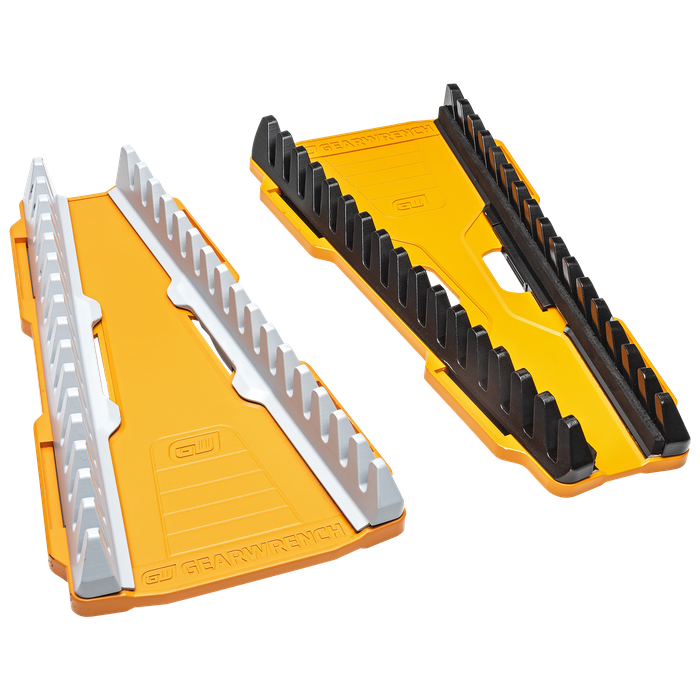 The GEARWRENCH 83121 Reversible Wrench Rack Set contains 2 space-saving organizers that each hold up to 16 SAE or metric wrenches, of sizes up to 1 inch or 25mm. Designed for the professional automotive or industrial technician, these racks include key usability features like the self-aligning, quick change, & reversible side rails along with the reinforced plastic composite material slots that guides wrenches so they always face forward for quicker & easier identification. Our angled design takes up 30% less space in your tool drawer, and the two included racks have different colored side rails for easy differentiation.