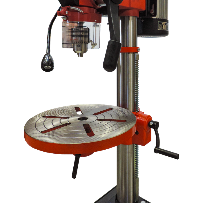 With five spindle speeds ranging from 180 to 3320 RPM, this drill press is versatile enough to handle a variety of materials including wood, metals, and plastics. The ergonomic 3-handle feed wheel facilitates smoother operation, while safety features like the Emergency stop button and chuck guard provide added protection.