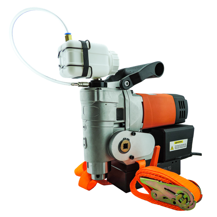 Engineered for convenience, it features a quick-release, detachable ratcheting feed lever that can be fixed on either side, allowing operation from any angle. At only 11.5kg, its lightweight design makes transport and positioning hassle-free, especially with its integrated carry handle. The drill also comes with an extra, detachable, adjustable cooling container to ensure optimal performance, even in extended use. Additionally, a built-in slot allows for the attachment of the provided safety belt, giving you the confidence to work safely on vertical and overhead surfaces.