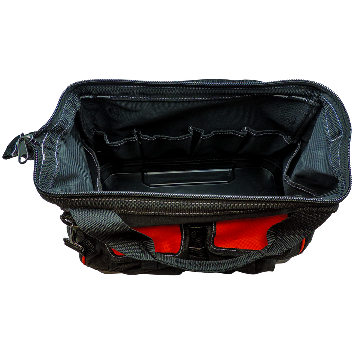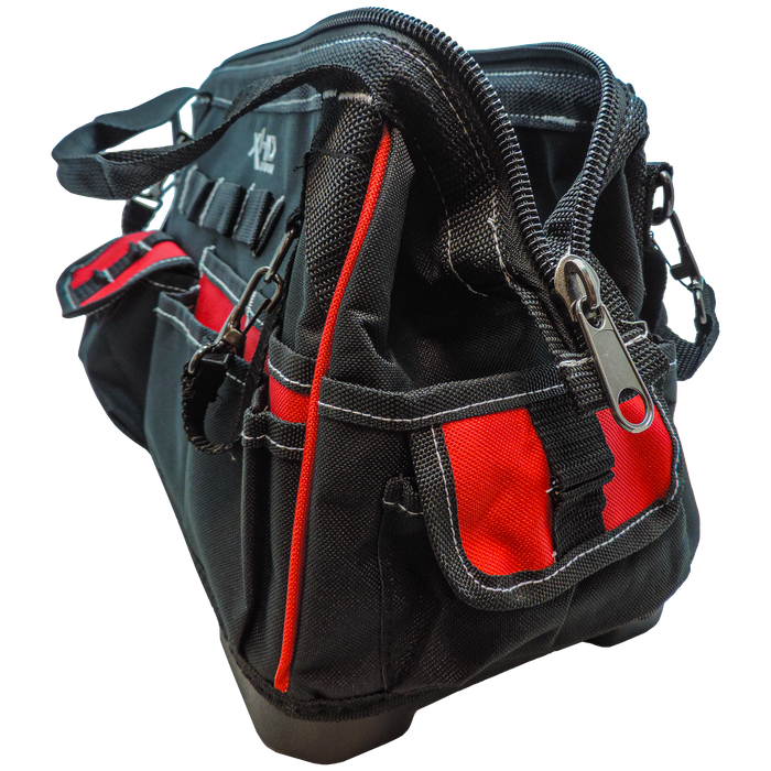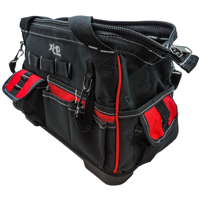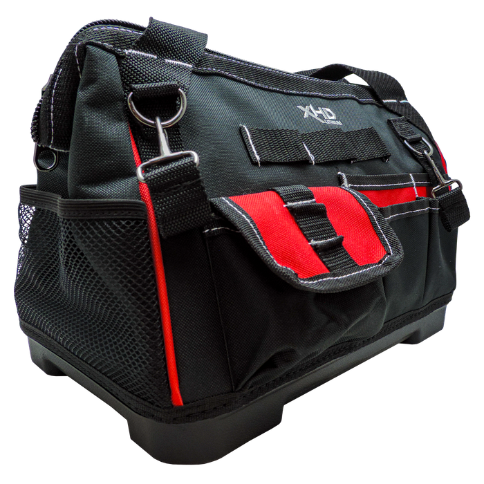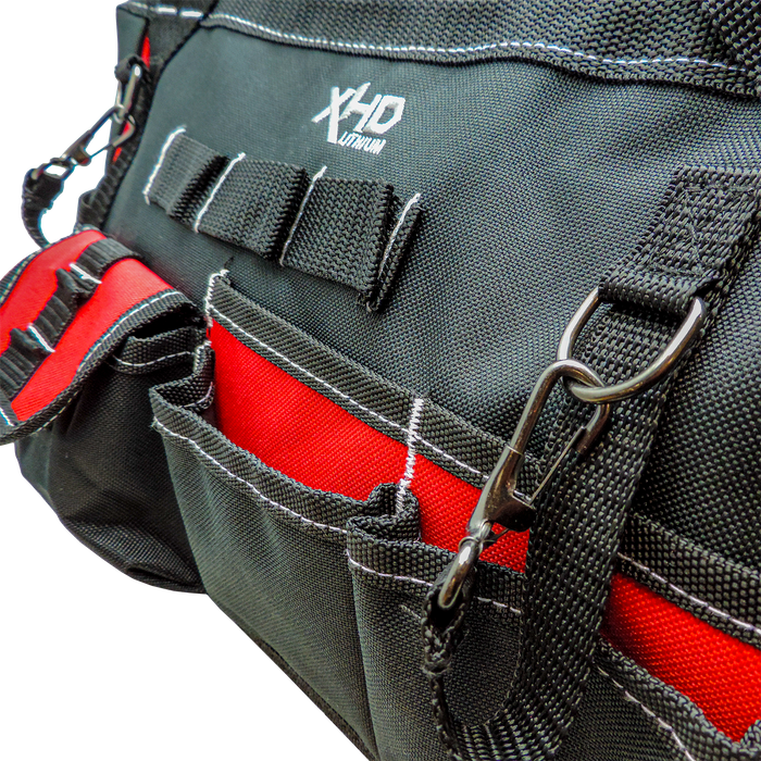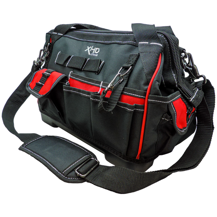 The bag features a robust canvas carry handle along with a shoulder strap that includes soft foam and rubber grips, ensuring maximum comfort during transport. The sturdy plastic base provides essential protection against moisture, keeping the contents safe and dry, even in tough outdoor conditions. Measuring 340 x 190 x 210, the XHD Lithium Tool Bag holds up to 20kg while remaining lightweight at just 0.96kg, making it a reliable companion for any job site or project.